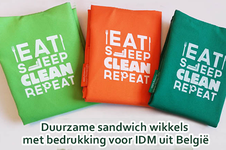 - Voor IDM uit België mochten we deze leuke, originele herbruikbare sandwich wikkels (wrappers) maken. Met hun eigen artwork erop gedrukt. IDM organiseert in opdracht van 6 gemeenten de afvalophaling aan huis en via de recyclageparken. Daarnaast zet IDM ook sterk in op bewustmaking rond duurzaam materialenbeheer. Ze waren op zoek naar geschikte relatiegeschenken die ze konden gebruiken in hun campagne voor het promoten van duurzaam materialenbeheer. Zo kwamen we op deze originele duurzame sandwich wikkels om de campagne kracht bij te zetten. IDM gaf aan dat: Ze het er erg mooi uit vonden zien. Daarnaast waren ze zeer tevreden over de snelle schakeling tussen IDM en ons en de snelle levering.